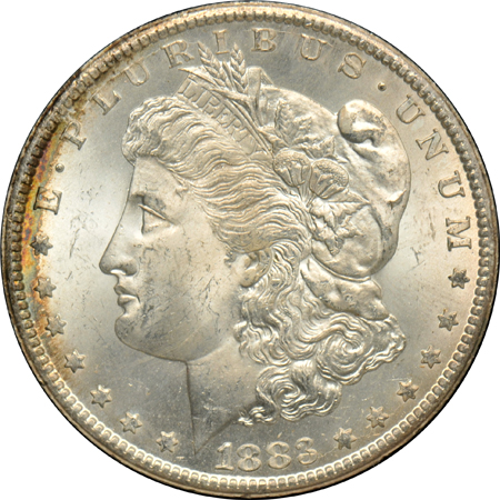 Description: A trio of 1883-CC Morgan dollars come close to the gem level, especially a pair that have earned a "plus" designation from NGC. One MS-64+ features very modest rim toning on the obverse, while the other displays a hint of semi-prooflike flashing brilliance. The MS-64 shows no toning at all over brightly frosted white surfaces.