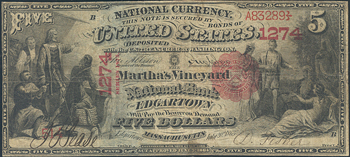 Description: The Martha's Vineyard NB of Edgartown, Massachusetts. Charter #1274. This extremely scarce Martha's Vineyard note is new to the census and straight-graded F15 by PCGS. Despite heavy wear, the note holds up well and even offers outstanding signatures, hardly faded over time. A pleasing problem-free example off this well-respected "name" bank.