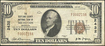 Description: The Scotland County NB of Memphis, Missouri. Charter #2432. This is a tantalizing, vintage Dexter note from southeast Missouri showing deep black signatures, albeit also some original staining. A trivial separation can be seen at the upper left corner.