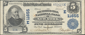 Description: The Richmond Hill NB of New York, New York. Very few large-sized examples are available off this Richmond Hill neighborhood bank, located in Queens. Very attractive signatures on this modestly bright and attractive note, although we must point out a tiny rust mark next to "NATIONAL BANK".