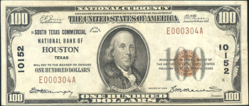 Description: South Texas Commercial NB of Houston, Texas. An opportunity to pick up a high grade 1929 Houston national presents itself right here with this nicer AU hundred. Look for two tiny pinholes just above the portrait, and rest easy knowing that they represent the only conceivable detraction.