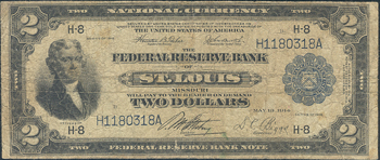 Description: This better 1918 type-2 St. Louis Friedberg number in perfectly original condition offers a lovely (for the VG level) problem-free appearance. Moderately soiled, paper exhibits a few tiny pinholes strewn off to the left, and perhaps a couple more off to the right.