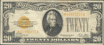 Description: The appearance is really quite decent for the VF grade level, offering very good ink and nice paper. PCGS notes an "edge tear", and it does indeed snake its way into the lower denomination area of the bottom front, but it may hardly detract from the appeal of a gold certificate "star" note.