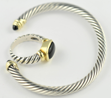 Description: Here we a 14K and sterling silver David Yurman, 5mm black onyx bracelet from his Cable Classic Collection. This lot also includes a 14K and sterling silver David Yurman black onyx ring from his Noblesse Collection. The total weight of this lot is 1.05 troy ounces.
