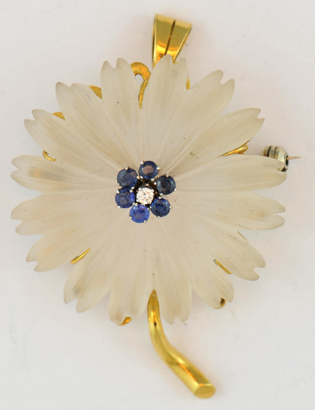 Description: This cute flower pin is crafted in clear camphor glass and has six small sapphires and a diamond in the center. Length 1 ½” x 1 ¼”, 9.0 dwt total.