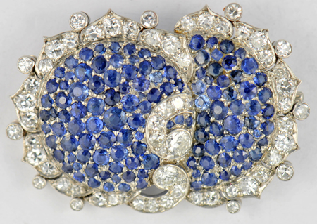 Description: This very interesting vintage pin has approximately 2.50 cttw in old cut round diamonds, SI quality, G color all set surrounding pave set old cut round sapphires with a beautiful cornflower blue color. Length 1 ½” x 1”, 6.4 dwt.