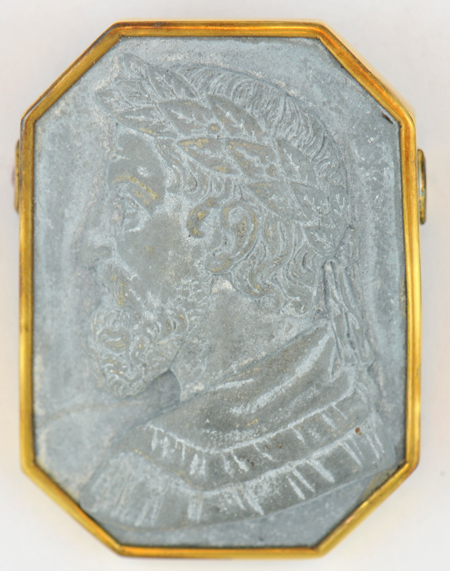 Description: This group includes four unique cameos all set in 14K yellow gold. The first is a pin/pendant crafted in coral with a free form frame. Next up is a circular shell cameo pin/pendant with an elegant lady’s profile and clean-cut frame with a twisted rope accent. Next we have a black hardstone cameo pin/pendant with a geometric frame. Lastly, there is a lava stone cameo pin depicting the great Aristotle with a thick, plain frame hugging the octagonal cameo. 30.3 dwt total.