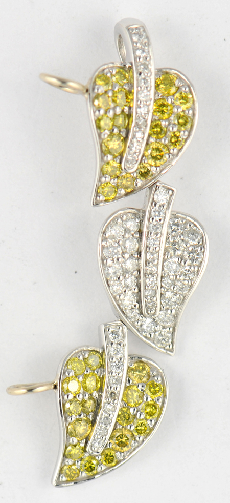 Description: This versatile pendant can be worn horizontally or vertically and has three leaf decals, two with yellow diamonds and one with white diamonds. There is approximately .75 cttw in diamonds with SI1 quality. 2.1 dwt.