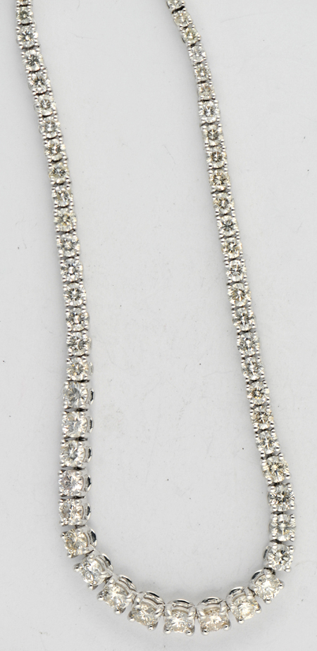 Description: You will feel like a princess when you slip this dazzler around your neck! There is approximately 11.00 cttw in brilliant cut round diamonds, SI2-I1 quality, I-J color. The diamonds are graduated in size and are each individually set with four prongs. This incredibly simple-yet-striking piece is going to be a fan favorite! Length 16”, 26.6 dwt.
