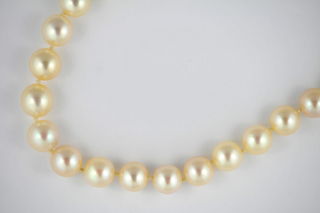 Description: From the Pennsylvania Dutch Collection, this elegant single strand of continuous pearls does not contain a clasp and has 76 approximate 9mm round whitish-ivory pearls with good symmetry, good luster and moderate blemishes. If you do not already have a set of larger pearls, this would be the perfect addition to your collection! Length 30”