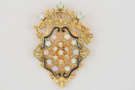 Lot Title: 14K Yellow Gold Opal, Diamond and Enamel Pendant