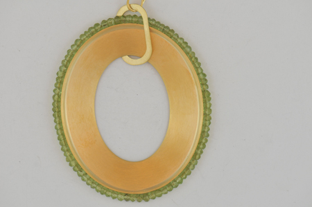 Description: This unique Italian-made pendant features beaded peridot stones strung around an oval shaped brushed gold open pendant hanging on a double strand, thin link chain. Length 24”, 16.7 dwt.