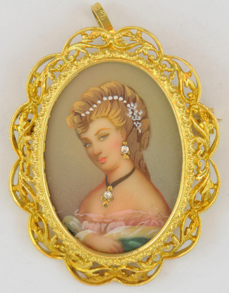 Description: Here we have a set of three portrait pendants that double as pins. All three have intricate frames crafted in yellow gold, two are 18K and one is 14K. All appear to be hand painted. Wouldn’t it be fabulous to be able to wear a different one each night? 21.1 dwt total.