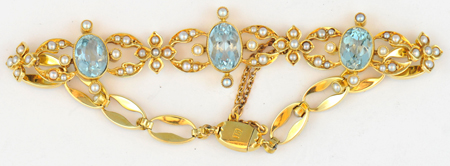 Description: This super sweet vintage bracelet is adorned with lovely seed pearls and three 8x6mm oval aquamarine stones set in milgrain bezels. Length 7”, 8.8 dwt.