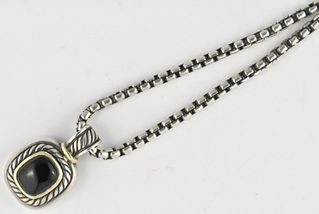 Description: In this lot we have a 14K and sterling silver David Yurman 18” box chain from his Chain Collection and a 14K and sterling silver black onyx pendant from his Albion Collection. The lot also includes a matching pair of 14K and sterling silver David Yurman black onyx earrings from his Albion Collection. This lot weighs a total of 1.82 troy ounces.