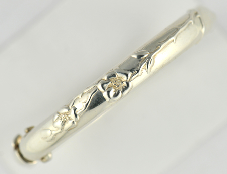 Description: In this lot we have two pairs of Tiffany and Co. earrings, two rings, a bangle and a pin. The first pair of earrings are Tiffany and Co. sterling silver, 10mm twist knot stud earrings. The second pair are Tiffany and Co. sterling silver diamond mesh drop dangle earrings. The first ring in this lot is a Tiffany and Co. sterling silver mesh ring, 10mm wide, finger size 6.5. The second ring is a Tiffany and Co. sterling silver wide grooved band circa 1995, 9mm wide, finger size 6.25. The bangle is a Tiffany and Co. sterling silver nature flower rose bangle with a Tiffany and Co. suede pouch. Finally we have a Tiffany and Co. sterling silver marigold pin that is 1.5” in diameter. The total weight of this lot is 2.85 troy ounces.