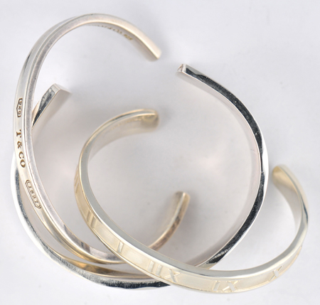 Description: This lot contains three Tiffany and Co. Cuffs. The first cuff is a Tiffany and Co. sterling silver 1837 collection cuff, 9mm wide, with a Tiffany and Co. box. The second cuff is a small Tiffany and Co. sterling silver Atlas Roman numeral cuff with a Tiffany and Co. suede pouch. The third cuff is a Tiffany and Co. sterling silver 1837 collection cuff, 5mm wide, with a Tiffany and Co. suede pouch. The total weight of this lot is 4.18 troy ounces.