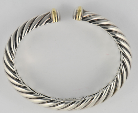 Description: This lot contains a David Yurman bracelet, ring, pendant and a pair of earrings. The bracelet is an 18K and sterling silver, 15 mm wide hinged bangle from his Waverly Collection. The ring is a 14K and sterling silver David Yurman dome ring from his Thoroughbred Collection. The pendant is an 18K and sterling silver David Yurman pendant with an enhancer from his Albion collection. The earrings are 18K and sterling silver non-pierced earrings from his Albion Collection. Altogether they weigh a total of 2.96 troy ounces.