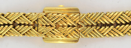 Description: This Cartier ladies watch has a hidden face on a double woven 18K yellow gold band that has a lid that goes over the face and is hinged at 12 o’clock. This nice piece of jewelry doubles as a watch and who doesn’t love multitasking? Length 7”, 31.7dwt.