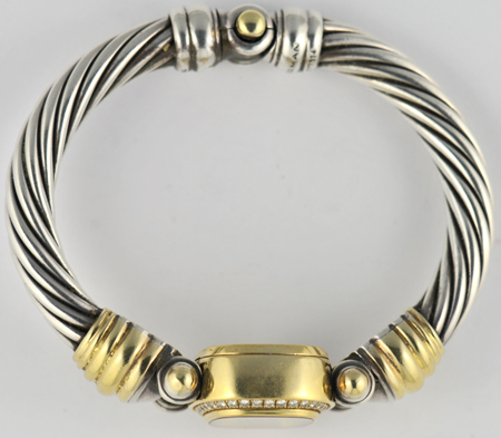 Description: Here we have an 18K and sterling silver David Yurman bangle watch with a diamond bezel and a white pearl face weighing 1.69 troy ounces.
