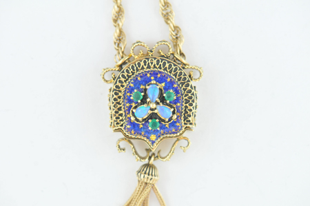 Description: This is pretty neat! Hanging from the 14K yellow gold rope chain is small sized ladies Geneva watch enclosed in a case that slides up and down to hide the watch when you don’t want it to be seen and also has dangling tassel decorations hanging from it. The outside of the case has beautiful blue enameling, opals and emeralds! Always have the time but no one will even know you are wearing a watch! Length 34”, 31.5 dwt.