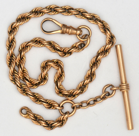 Description: Here we have a 10K yellow gold tested man’s rope style watch chain weighing 21.7 dwt.
