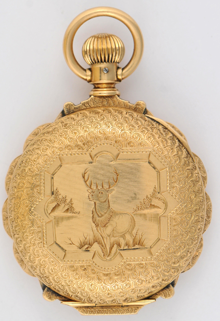 Description: This stunning 7-jewel movement man’s St. Louis Watch Co. pocket watch is made of 14K yellow gold and is lever set. This 18 size watch winds, sets and runs and weighs 97.8 dwt. The front of the watch is monogrammed with an elaborate design and the back has a deer design.
