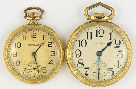Description: a. Waltham man’s non-running pocket watch, lever set, 16 size. b. 10K yellow gold filled Phil Herbert man’s pocket watch. This 16 size watch winds, sets and runs. The watch has a clean face, but the back is worn in many areas. c. Yellow Gold filled Elgin man’s non-running pocket watch, 16 size. The gold filled is heavily worn off the back and the movement is signed “W.C. Raymond”. d. 10K yellow gold filled Hamilton man’s double roller pocket watch. This 16 size pocket watch winds, sets and runs. Unfortunately, the watch face has many cracks. e. Elgin man’s pocket watch. This is a lever set 16 size watch that winds, sets and runs. It has a movement signed “Father Time” and a cracked face. f. 14K white gold filled Ball Watch Company man’s pocket watch. This is a lever set 16 size watch that winds, sets and runs. g. 14K yellow gold filled Studebaker man’s pocket watch. This is a stem set 12 size watch that winds, sets and runs. h. Elgin man’s pocket watch with a silverode case. This is a 12 size watch that winds, sets and runs with a movement signed “Father Time”.