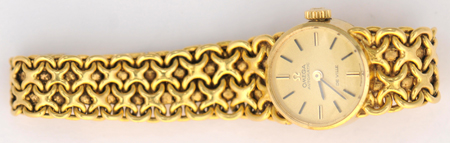 Description: a. 14K yellow gold ladies automatic Omega De Ville watch. This watch 5 ½” watch has an oval face with a woven band. The total weight is 21.7 dwt. b. 14K white gold ladies diamond Ollendorff watch with approximately 1.00 cttw of brilliant cut round and single cut diamonds. This 6” watch winds, sets and runs and weighs a total of 12.5 dwt. c. 14K rose gold ladies diamond and ruby Ollendorff watch. This 5 1/2” watch has approximately .12 cttw of single cut diamonds and .06 cttw of rubies. The total weight of this watch is 14.2 dwt.