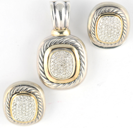 Description: In this lot we have a David Yurman bracelet, ring, pendant and a pair of earrings. The bracelet is an 18K and sterling silver, 7mm wide cable bangle with .49 cttw of diamonds from his Cable Classics Collection. The ring is an 18K and sterling silver cable design ring with .40 cttw of diamonds. The pendant is an 18K and sterling silver David Yurman pendant with an enhancer with diamonds from his Albion Collection. The earrings are 18K and sterling silver non-pierced earrings with diamonds from his Albion Collection. This lot weighs a total of 2.94 troy ounces.