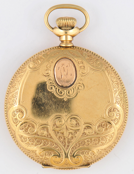Description: Here we have a 21-jewel man’s Elgin hunter case pocket watch made of 14K yellow gold, weighing 57.1 dwt. This watch is in excellent shape with an engraved “N”. This is a very nice piece that winds, sets and runs.