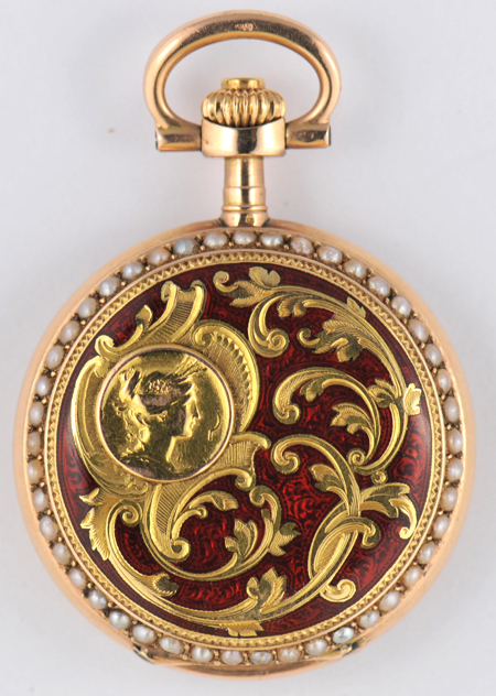 Description: Here we have six ladies watches made of 14K yellow gold. All of these watches wind and set. Four watches are open face watches and two are hunter cases. There is also one beautiful red enameled case with small pearl accents.