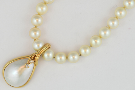 Description: This pearl strand contains 21” of 6-6.5mm cultured salt water pearls with ivory color, good symmetry and good luster. There is a 14K white gold clasp. Also included is a removable 14K yellow gold enhancer containing a pear shaped freshwater pearl and two small diamond accents. To match the pearls when you are not wearing the enhancer, there is a three-strand pearl bracelet with slightly smaller pearls measuring at approximately 5mm with a starburst 14K white gold clasp with diamond and pearl accents! Length 7”.