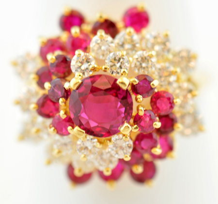 Description: Here we have a gorgeous 17 1/2K diamond and ruby cluster ring with the main stone being a 6mm round ruby with deep red color and average quality. Cascading down from the center is approximately 1.20 cttw in brilliant cut round diamonds, SI quality, H color and 1.20 cttw of matching round red rubies. The matching clip-on earrings are set in 18K yellow gold and have a swirled pattern of diamonds weighing approximately 1.20 cttw, SI1 quality, G color and brilliant round red rubies weighing 1.50 cttw with slightly above average quality. Do not fret if you prefer pierced earrings, these can easily be converted! Ring size 7.25, 12.1 dwt.