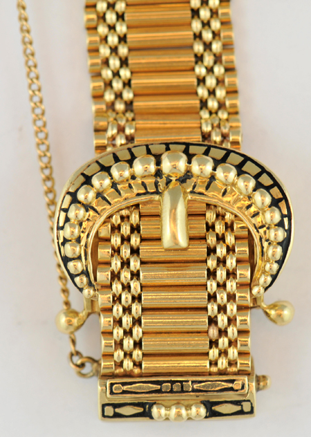 Description: This Victorian inspired buckle watch and earring set has black enameling detailing as well as mesh tassels. The watch is made by Balta but can be worn as a bracelet. The watch has not been tested to see if it is working condition. 43.7 dwt total.