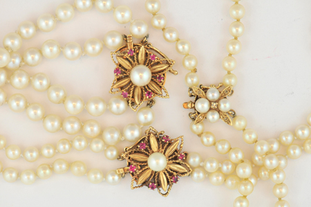 Description: Here we have two double strand pearl necklaces with pearl and ruby clasps. One is 14” with 6mm pearls and the other is 24” with 5mm pearls. There is also a 6 ½” double strand pearl bracelet with 5mm pearls and a pearl and diamond clasp.