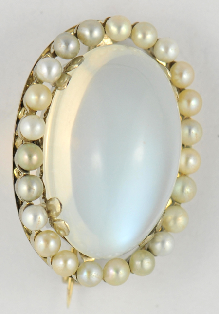 Description: Said to carry a certain mystique, the moonstone is a gemstone that you don’t see in fine jewelry all that often. This stone measures 21x13mm and is a pale blue color with a shimmering effect that is mesmerizing! Surrounding the gem are small seed pearls ranging from light gray to beige pulling out all of the colors that the stone radiates. Length 1” x ¾”, 6.2 dwt.