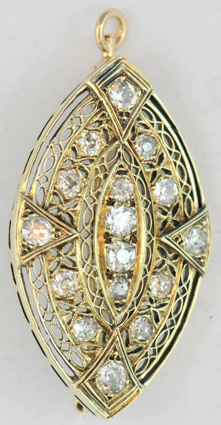 Description: This marquise shaped vintage pin has approximately 1.25 cttw in old cut round diamonds with SI quality, J color set amid open wire work and bold geometric designs. There is a flip down bale so it can double as a pendant. Length 1 ½” x ¾”, 4.4 dwt.