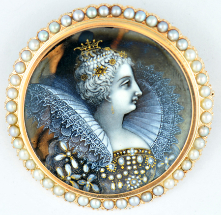 Description: Depicted on this spectacular hand painted portrait is one of the British queens, possibly queen Victoria. Surrounding the circular disc that is in excellent condition is a halo of seed pearls all matching and in good condition! Length 1 ½” in diameter, 9.1 dwt.