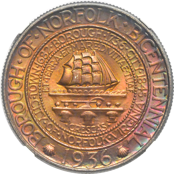Description: West Jefferson Collection. 84 graded MS-68, 3 higher at NGC. Upon first glance of the obverse, one might be led to believe that this utterly splendid Norfolk had been struck in copper, because the extraordinary and rare alchemy of malachite, deep ruby-magenta and shimmering subtle orange are highly reminiscent of a classically oxidized copper objet d'art. The effect is simply magnificent, especially as good illumination activates the sheening, potent luster on that side. The coin must be flipped over to affirm silver content, although the reverse itself is no slouch at all when it comes to eye-appeal. On this side, enchanting chartreuse dominates except at portions of the border where vivid, slender bands of rainbow color accent peripheral lettering. Many Norfolk half-dollars have been preserved at the MS-68 level (very few grade higher, though), but one wonders how it would be possible to surpass the inexhaustible eye-appeal of this example, hence the Scotsman Cataloger's Choice makes perfect sense. A truly stunning jewel destined for the collector who acknowledges that coins CAN be works of art, given a sufficient passage of time, and proper circumstances.