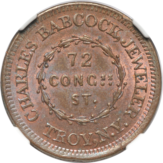Description: Berry Tree Collection. An exceptional (despite the PCGS MS-61 grade) Fuld-525a "S.H. Zahm / Benjamin Franklin" token shows the semi-reflective fields usually seen for the type, and it is one of the very popular advertising pieces due Franklin's motif. A quintet of copper pieces showing NGC grades and attributions accompanies, as follows: Fuld-630AL / 5a "George Hyenlein / Not One Cent" (MS-64 RB), Fuld-630AO / 2a "Koops Segars & Tobacco / Erinnerung" (MS-62 BN but gorgeous), Fuld-630BO / 2a "Edwd Schulze's Restaurant / 1863" (MS-63 BN and just terrific), Fuld-630AP / 16a "H.M. Lane Lamps & Kerosene Oil / Not One Cent" (MS-63 BN), and Fuld-890A / 1a "Charles Babcock, Jeweler / 1863" (MS-64 BN, stunning bluish iridescence). Quite an array of fascinating Civil War pieces in this six coin lot.