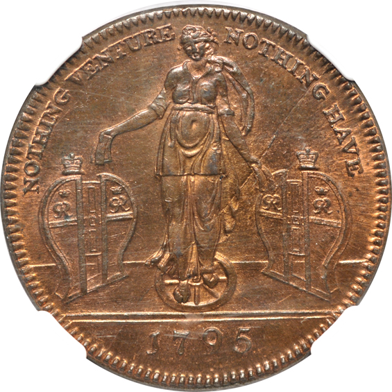 Description: Berry Tree Collection. First is D&H-467 (NGC MS-64 RB), a halfpenny issued by Richardson, Goodluck & Co., who were stockbrokers and lottery-office keepers in the west end of London. Legend has it that "Goodluck" was the name of an old woman who was hired by the firm purely for the use of her last name in advertisements. Second is D&H-4, a halfpenny that shares motifs with D&H-5, but should show different wording on the edge (not very visible despite the NGC EdgeView holder). The obverse features Justice standing above the 1794 date in exergue on the obverse, and a small lion above the RD cipher on the reverse. Original flips included with this two coin lot.