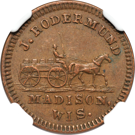 Description: Berry Tree Collection. Popular due to the famous motif, the obverse features a horse-drawn beer wagon, rendered in rather fine detail. Issued by John Rodermund, the motif has at least a couple of other die pairings, all of which are very rare. The present 410G-2a shows precious little wear and benefits from premium, original brown patina. Plated on the cover of the new book, "U.S. CIVIL WAR STORE CARDS", is a photo of another example of F-410G-2a in similar condition, and it has been reported that that example sold for about $4000. Hence, the value offered here should be apparent.