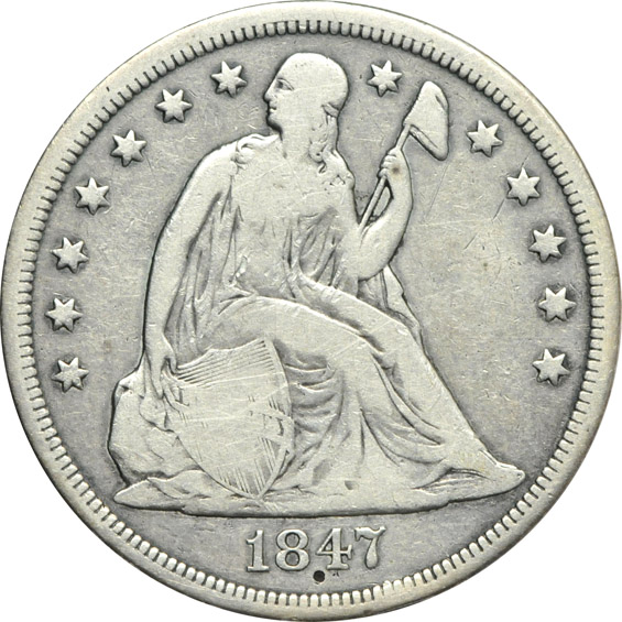 Lot Title: 1847 Seated Liberty silver dollar VG details/damaged, 1877 Trade silver dollar XF details/cleaned, and a 1921 Peace dollar AU