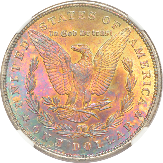 Description: Possibly certified from a single roll, flamboyant eye-appeal readily emanates from this trio of 1884 Morgan dollars. That given NGC's MS-65 "star" features an astonishingly vivid accent of deep, rich turquoise, electric magenta, and solar-gold utterly blazing across 40% of the obverse. The swooning effect all by itself is worth the price of admission ... but wait, there's more. The MS-64 "star" offers a dead-on impressionist version of an April sun rising over the placid cobalt-blue waters of a tropical ocean. Yes, that's right, you'll know just what I mean when you see it. Abruptly, a single MS-64 trails it's big brothers and offers merely a light wash of almond-amber across much of the obverse. Don't miss the mesmerizing visual feast made available by this three coin lot.